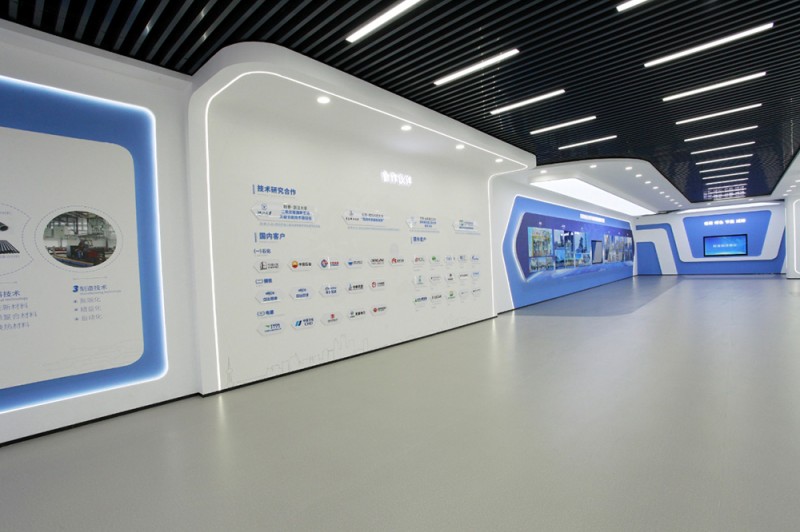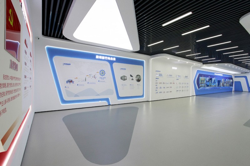 頂和地面造型統一,白色吊頂和灰色橡膠地面,黑色方鋼吊頂和灰色橡膠地面相互呼應,統一中富有變化,變化中又蘊含統一,使整個展廳科技意境深遠悠長。